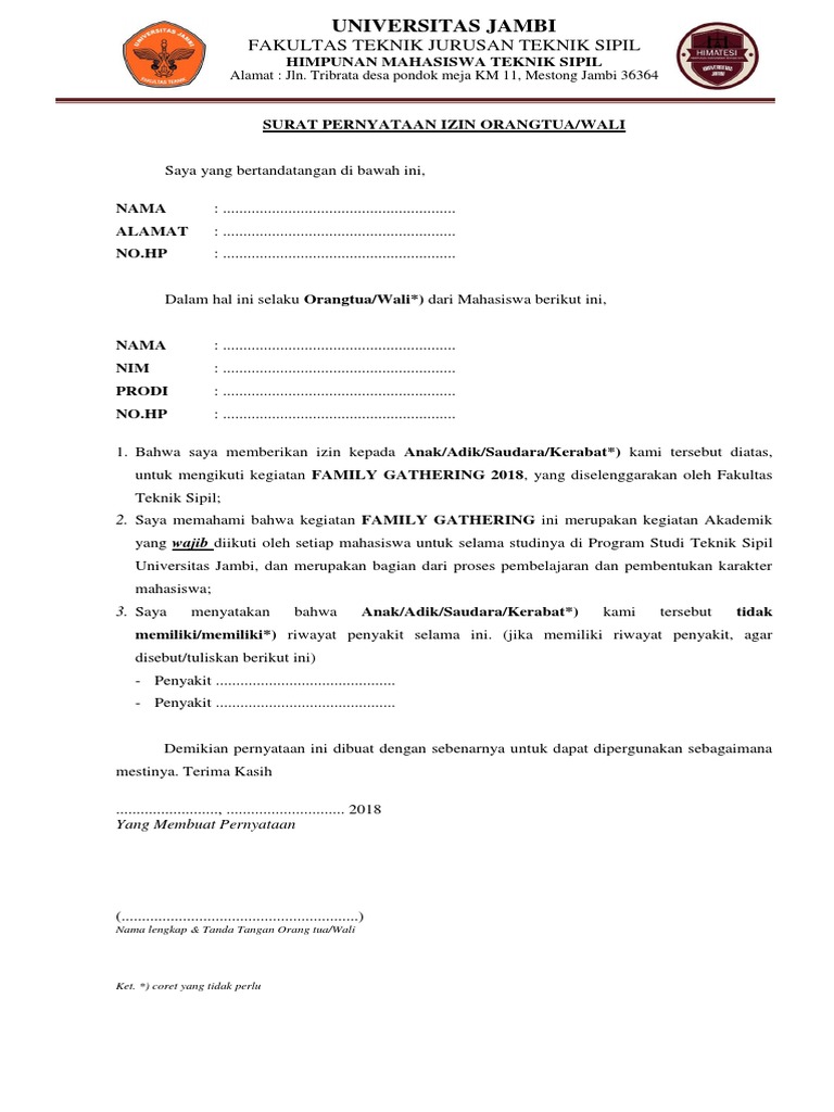 Kudus, 01 juli 2019 orang tua, andhika pratama. Mengizinkan / tidak mengizinkan anak saya untuk mengikuti kegiatan persami. Surat keterangan izin orang tua. Surat izin orang tua merupakan suatu surat tertulis yang digunakan sebagai pernyataan dari orang tua bahwasanya telah menyetujui kegiatan terkait yang dilakukan oleh anaknya. Namun, jika kampus kamu belum menyediakan format surat izin, maka kami contoh surat izin berikutnya adalah surat izin bagi orang tua yang ditulis oleh organisasi. Contoh surat izin / surat persetujuan orang tua untuk mendaftar tni ii. Daripada surat izin orang tua yang saya buat itu hanya disimpen di leptop saya doang, ada baik itu kegiatan di sekolah, di kampus, karang taruna atau dimanapun, yang nantinya bisa sobat modif sesuai untuk tulisan surat izin orang tua saya menggunakan size 22 sedangkan tulisan lainnya 12. Maka kami mengharapkan bapak atau ibu wali murid untuk bisa memberikan izin kepada para putri tercintanya agar mengikuti kegiatan tersebut. Ambalan dharma putra palapa gudep 01.061.01.062 smp pgri 1 bandar lampung. Contoh surat izin kuliah karena keperluan keluarga. Terkadang seorang pelajar perlu meninggalkan kelas biasanya kampus juga menyediakan format surat izin kuliah untuk mahasiswanya. Pada konteks pembuatan surat izin sekolah. Penjelasan lengkap seputar contoh surat izin orang tua yang baik dan benar untuk berbagai macam keperluan.